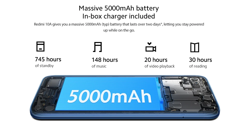 Redmi 10A gives you a massive 5000mAh (typ) battery that lasts over two days*, letting you stay powered up while on the go.