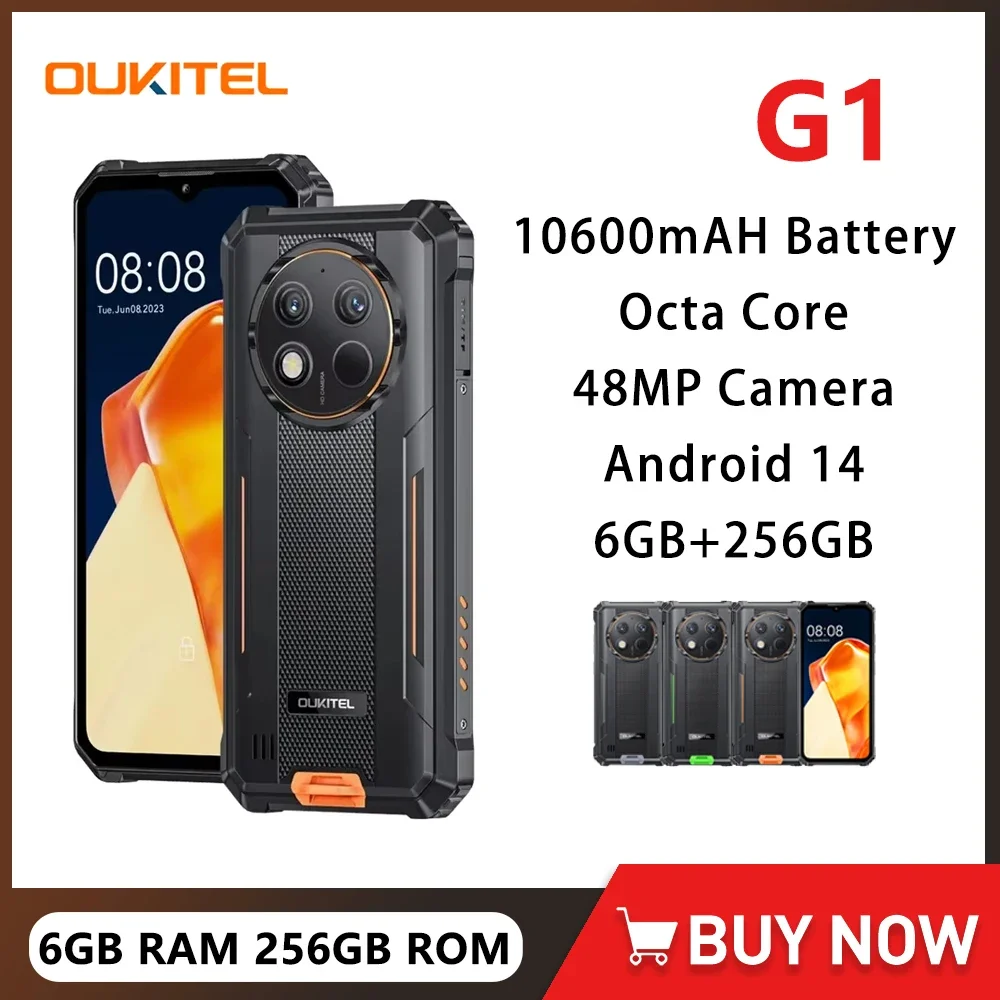 Oukitel G1 Rugged Smartphone Android 14 10600mAh Battery 6GB RAM+256GB ROM Mobile Phone 6.52Inch HD+ Octa Core 4G Cellphone NFC