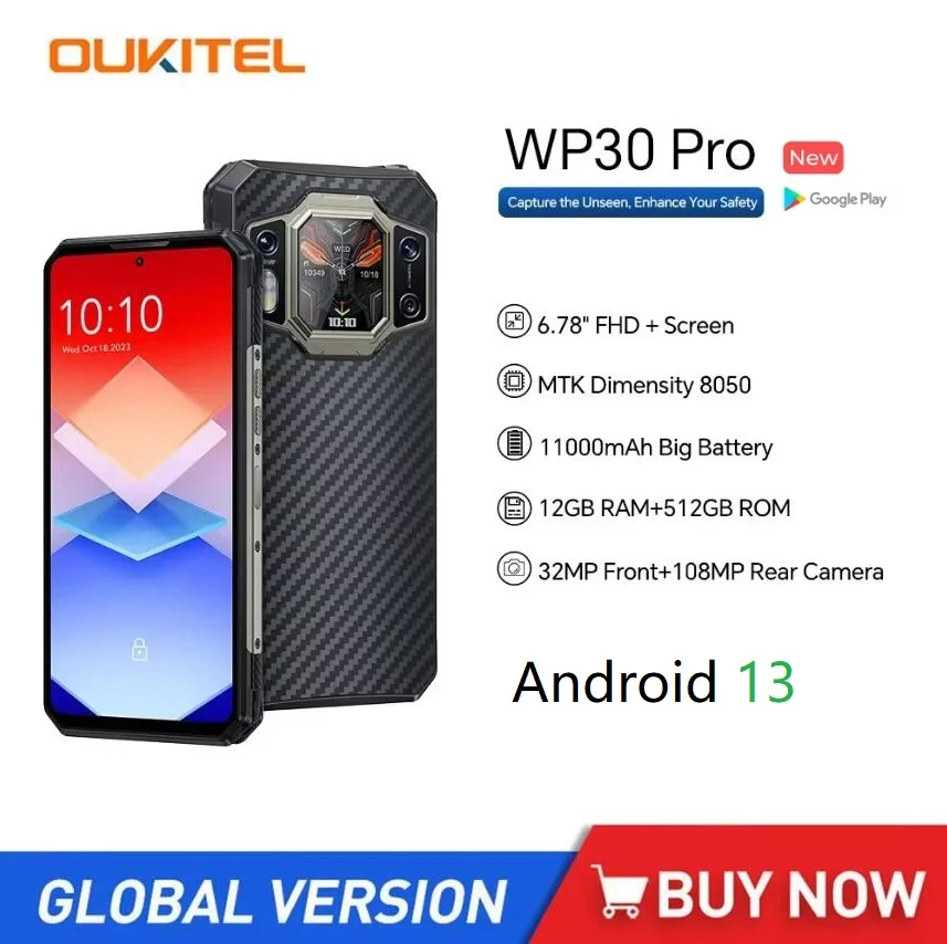 Oukitel WP30 Pro 5G Rugged Smartphones Android 13,Octa Core 12GB+512GB 6.78Inch FHD Mobile Phone 108MP Camera 11000mAh NFC