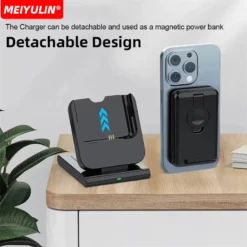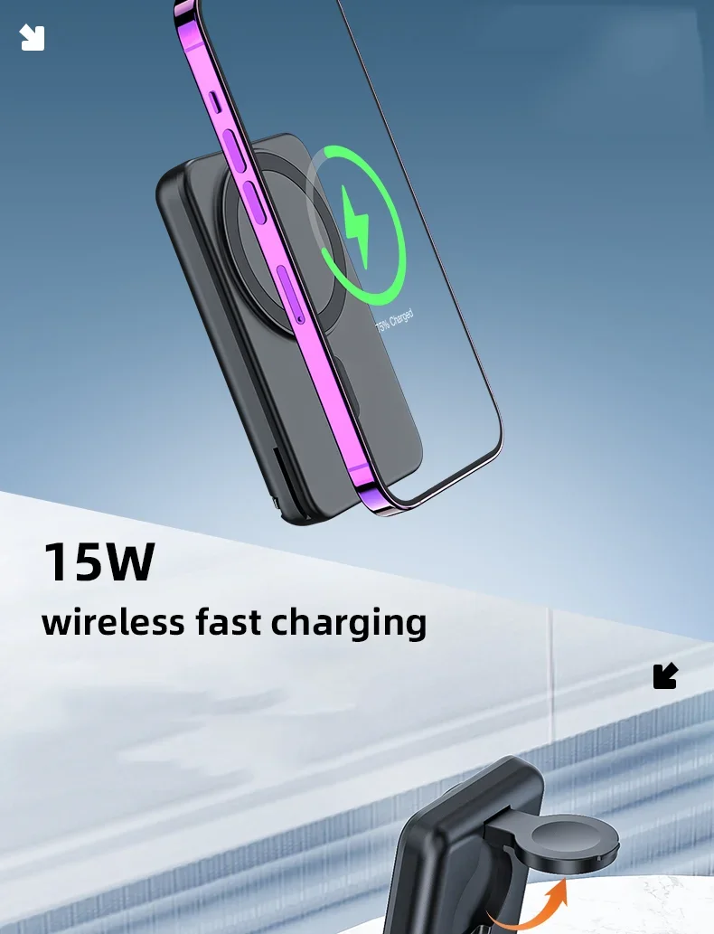 Foldable and detachable fast charging station. Can be used as a 3-in-1 wireless charger and a 2-in-1 magnetic power bank.