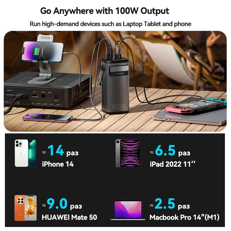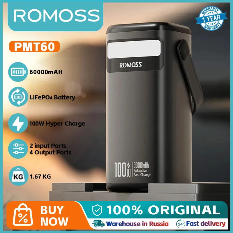 🌟Romoss pmt60 powerful power bank 60000mAh :100W Max Input/Output Fast Charging 🌟2 Input & 4 output Ports 6000mah power bank :USB A1 Output :22.5W(Max)|USB A2 Output :22.5W(Max) |LED Display |Type-C1 Input & Output :100W(Max) |Type-C2 Input & Output :100W(Max) 🌟 Low-Current Mode best fast charge power bank : Double press the Power Button Exit the Mode:Slightly press the Power Button 🌟usb c pd power bank Versatility for More Devices : :For Laptops( For MacBook, MateBook,Xiaomi Notebook , Lenovo Notebook ) For Tablets , For Phones(For Xiaomi 14 ,Xiaomi 13 ,For iphone 15 , For HUAWEI , For SAMSUNG ) For Game Consoles(For Nintendo Switch) 🌟4-Device Co-Charging romoss 60000mah power bank : If multiple devices are charged at the same time.the fast-charging function is disabled