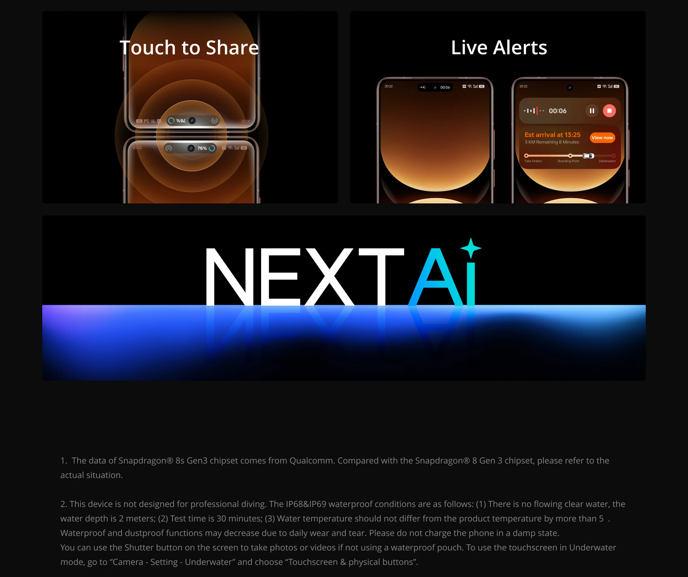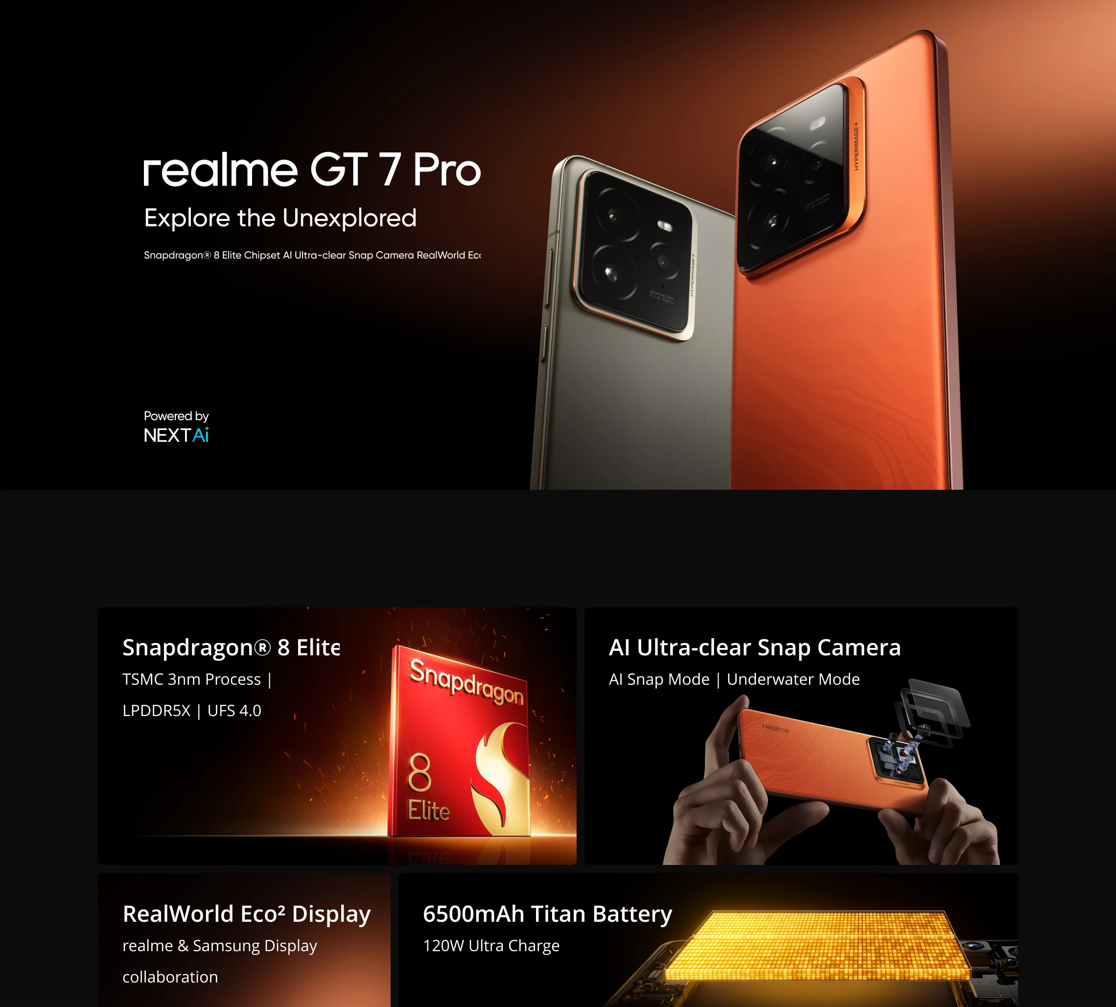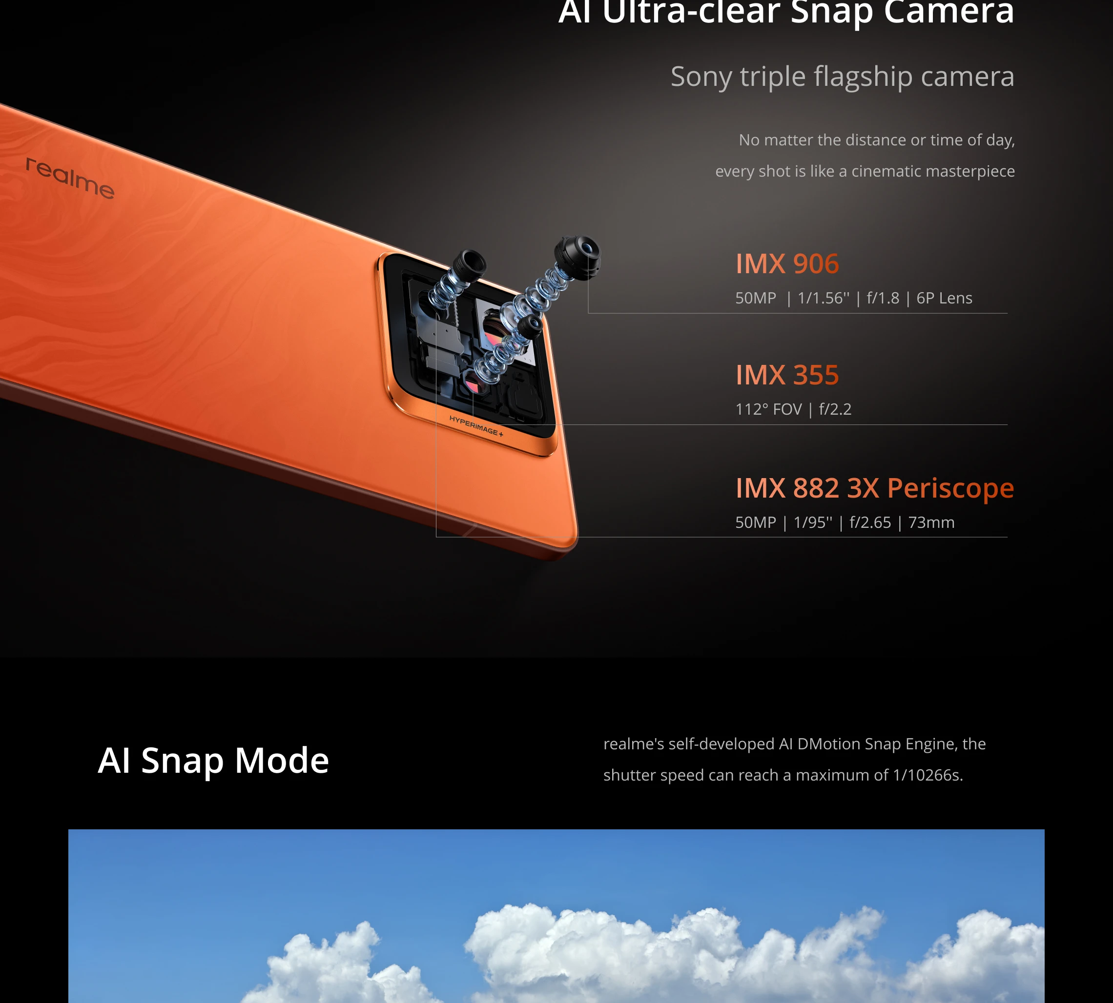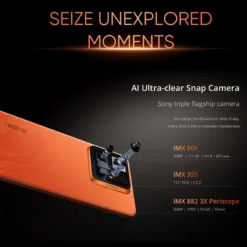 Camera: 50MPSony IMX882 3X Periscope Camera + 50MPSony IMX906 OISCamera + 8MP Sony IMX355 Ultra-Wide Camera, 16MP Sony Selfie Camera. (AI Ultra-clear Snap Mode, Underwater Mode)