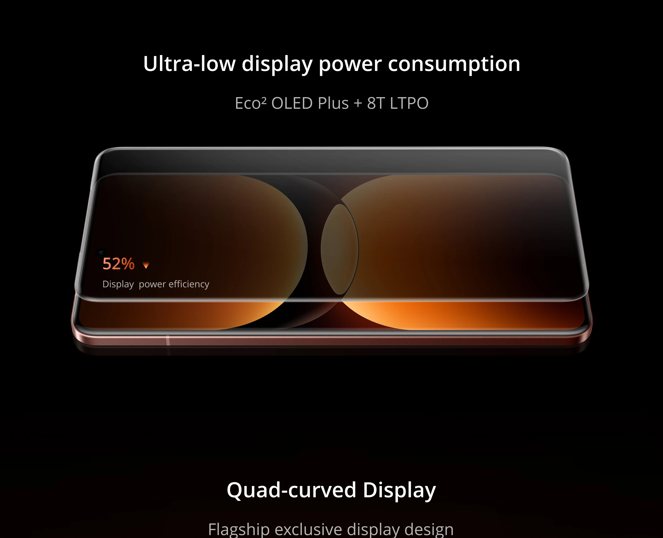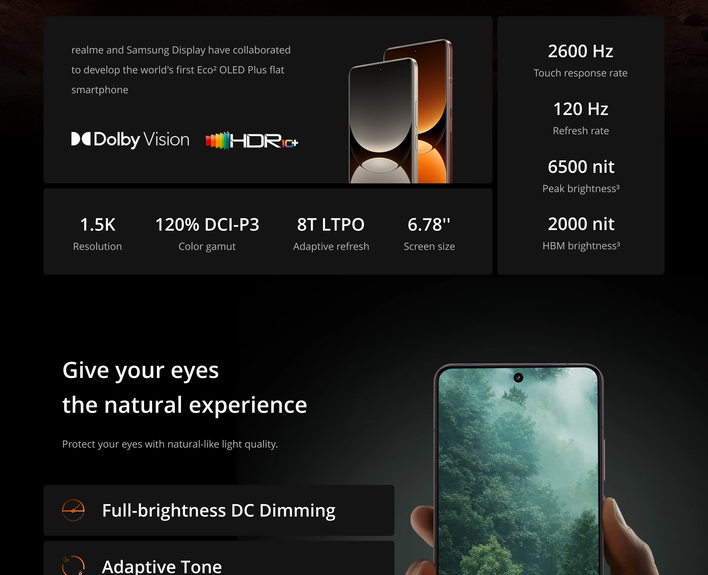 Display: 6.78″120Hz RealWorld Eco² OLED Plus Quad-curved Display; FHD+ 2780*1264(1.5k); Colour Gamut: 120% DCI-P3; Brightness: peak 6500 nit, HBM 2000 nit; Adaptive refresh: 8T LTPO; Touch response rate: 2600 Hz