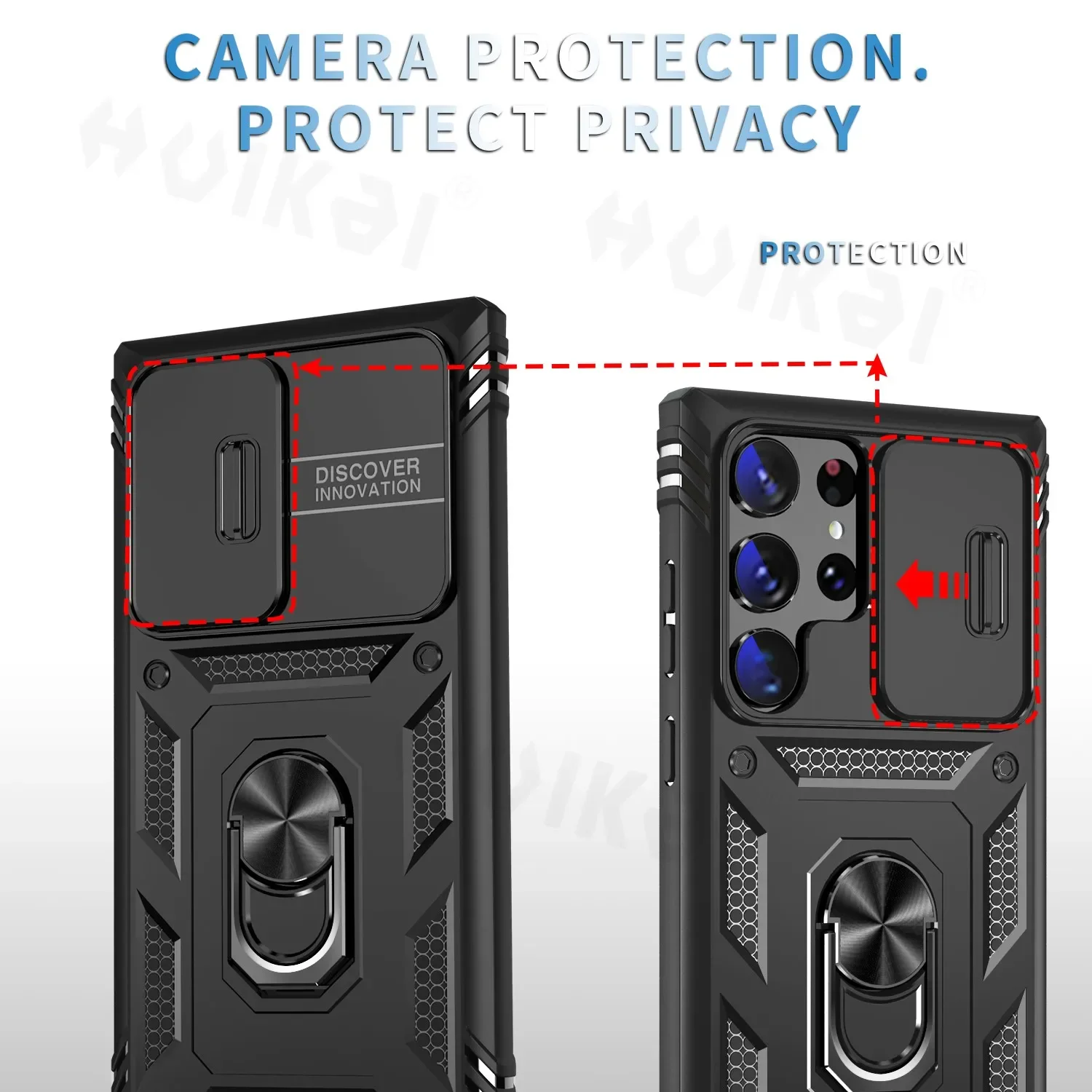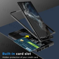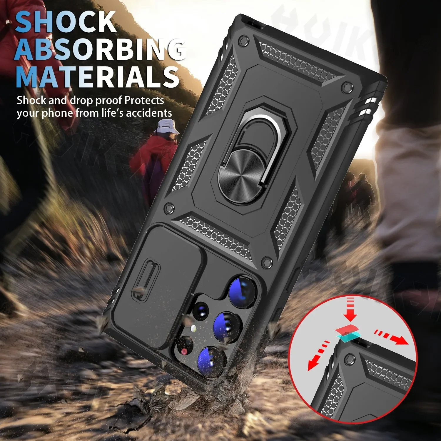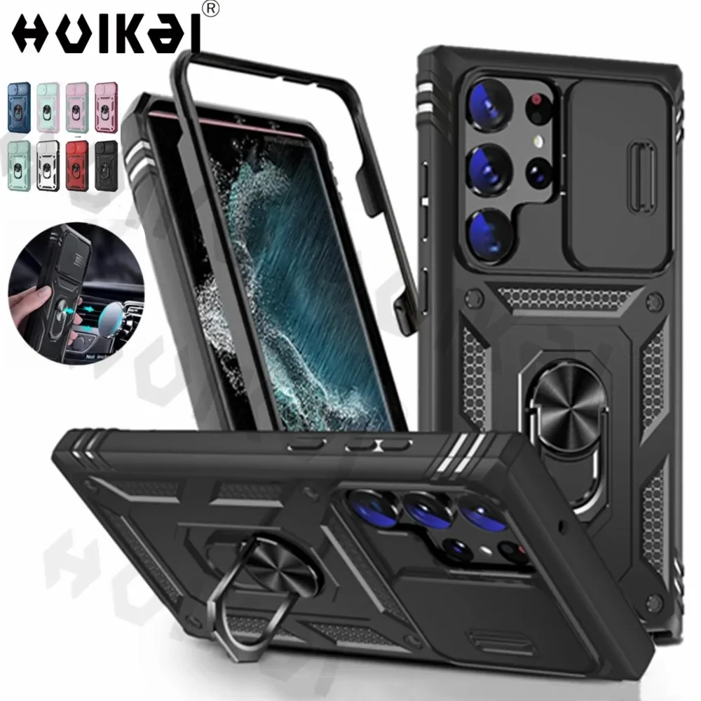 Specifications: Material: Polycarbonate, Thermoplastic Polyurethane Features: Water-Resistant, Anti-fingerprint, Heavy Duty, Dual Layer, Magnetic, Dustproof, Anti-Scratch, With Ring Special Feature: Non-slip, Sound Amplification, Camera Protection, Shockproof Package Dimensions: 6.77 x 3.19 x 0.39 inches Design and Style: Cool Army Style, Military Grade Usage and Purpose: Suitable for Running, Mountaineering, Camping, or Other Outdoor Sports Features: |Galaxy Galaxy S21 Ultra|Samsung S22 Vs A53|Samsung A73| **Unmatched Protection for Your Samsung Galaxy** The Case for Samsung Galaxy S24 Ultra, S23 Ultra, S22 Plus, S23 FE, S21, A14, A54, A52S, A34 is a testament to robust protection. Crafted from a blend of polycarbonate and thermoplastic polyurethane, this case offers a dual-layer defense against drops, scratches, and dust. The magnetic feature ensures that your phone stays securely in place, while the anti-fingerprint and water-resistant properties keep your device looking pristine and protected from the elements. **Designed for the Adventurous User** This case isn't just about protection; it's about functionality. The rotating kickstand ring allows for hands-free viewing, perfect for watching films, playing games, or engaging in online chats. The smart window design with a camera slide cover provides premium lens protection, ensuring your camera remains safe from scratches and impacts. The non-slip, oleophobic, and hydrophobic properties make this case ideal for outdoor activities, such as running, mountaineering, or camping, where your phone needs to withstand the elements. **Built to Last and Easy to Use** The case's army-style design is not only cool but also practical. It offers a strong, military-grade protection that is suitable for a variety of scenarios. The package dimensions are compact, making it easy to carry and store. The case is designed to be user-friendly, with a slight lock in each side to prevent the camera slide from randomly opening. If you encounter any issues with your case, our after-sale service is ready to assist, ensuring your satisfaction with our product.