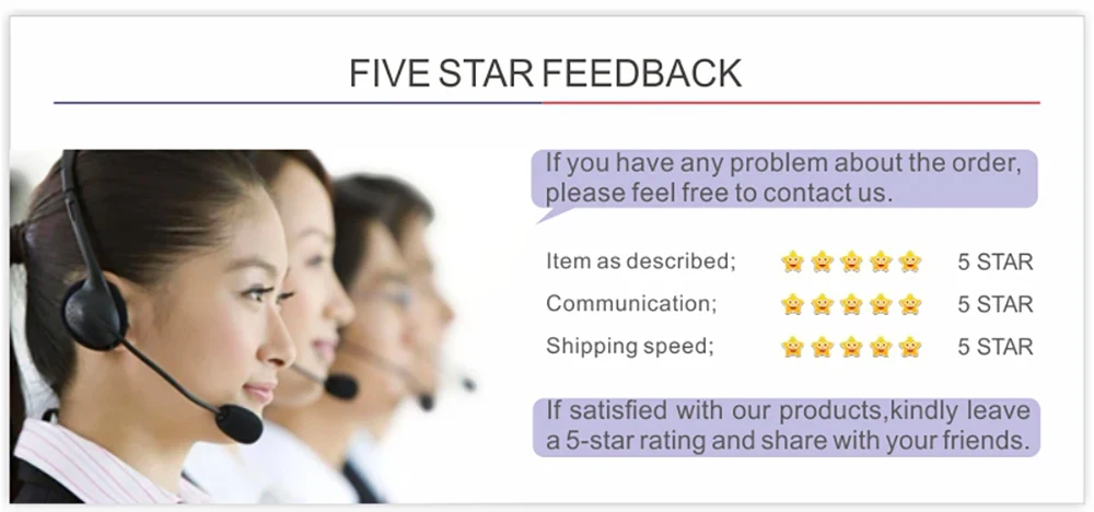 1.We rely on our reputation and customer satisfaction to succeed. Therefore , your feedback is extremely important to us. Please leave 5 star feedback to us if you are satisfied with our goods and service.
