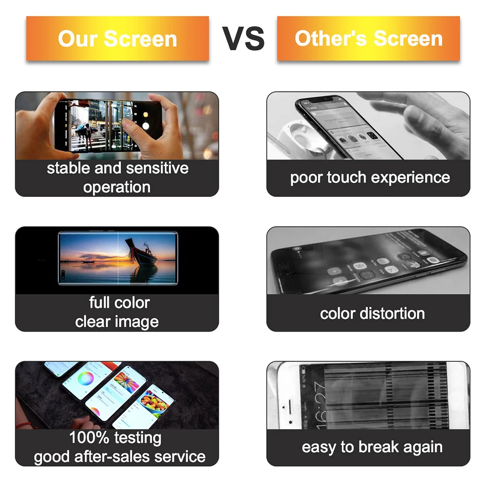 2. All the products, 12 months warranty, 100% brand new and strictly tested before shipment. Please DO NOT INSTALL before Testing(ONLY Connect LCD to mainboard for testing). Please inform us WITHIN 3 DAYS after receiving the parcel if you are dissatisfied with products (Real pictures, videos and other evidence must be given, escpecially the “RXGJ” tag to prove you bought the item for us), then we will offer replacement /refund services. WARRANTY VOID if LCD damaged after Installation. Order Non-Refundable! If you are satisfied with the products after testing. THEN you may install on your phone.
