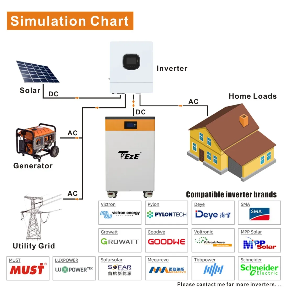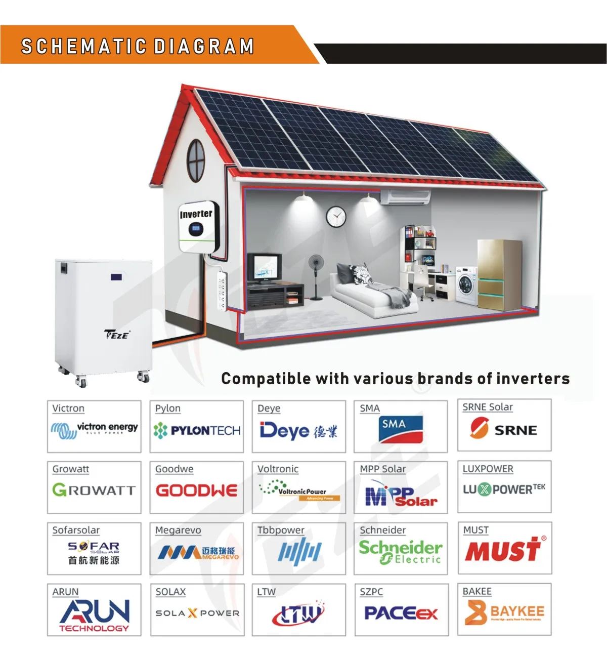 Specifications: Product Specifications: - Capacity: 300Ah - Voltage: 51.2V (16S) - Cycle Life: 6000+ Cycles @0.2C - Communication: RS485/CAN/RS232 - Compatible Inverter Brands: GROWATT, Deye, GOODWE, VICTRON, SOFAR, SRNE, VOLTRONIC POWER, and more - Dimensions: 520x300x900mm - Weight: 131KG Features: |51.2v 16s 6000+ Cycles| **Robust Energy Storage Solution** The TEZE LiFePO4 15KWH 48V 300Ah PowerWall Battery Pack is a game-changer in the world of renewable energy storage. Designed for those who demand reliable and efficient energy solutions, this battery pack is a perfect fit for a wide range of applications, from off-grid living to commercial solar installations. With a high-capacity 300Ah rating, it ensures that you have ample power at your disposal, making it an ideal choice for powering homes, businesses, or even electric vehicles. **Built for Durability and Performance** Crafted with the latest in battery technology, the TEZE PowerWall Battery Pack boasts a cycle life of 6000+ cycles at a low discharge rate of 0.2C, ensuring long-lasting performance and a reduced need for replacement. The inclusion of a built-in BMS (Battery Management System) with RS485/CAN communication allows for seamless integration with various inverter brands, offering compatibility and peace of mind. The robust design, including a fire extinguishing device and active balancer, ensures the safety and longevity of the battery pack, making it a reliable and safe energy storage solution. **Versatile and User-Friendly** This PowerWall Battery Pack is not just about performance; it's also designed with the user in mind. The compact dimensions of 520x300x900mm and a manageable weight of 131KG make it easy to install and maintain. The battery pack's compatibility with a wide range of inverter brands means that it can be tailored to suit your specific energy needs, ensuring that you get the most out of your renewable energy system. Whether you're looking to power your home, business, or contribute to a greener future, the TEZE LiFePO4 15KWH 48V 300Ah PowerWall Battery Pack is an excellent choice for anyone seeking reliable and efficient energy storage.