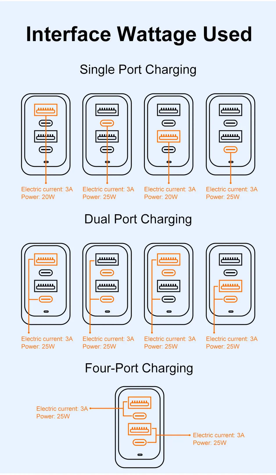 100w max. but 25w per output. not enough to charge a laptop at a fair speed, but will eventually charge it if the laptop is off. usb-c ports are not standard. my phone charges. my gopro battery charger can charge from the usb-c, but other things wont power up from them. but they work from the USB-A ports.