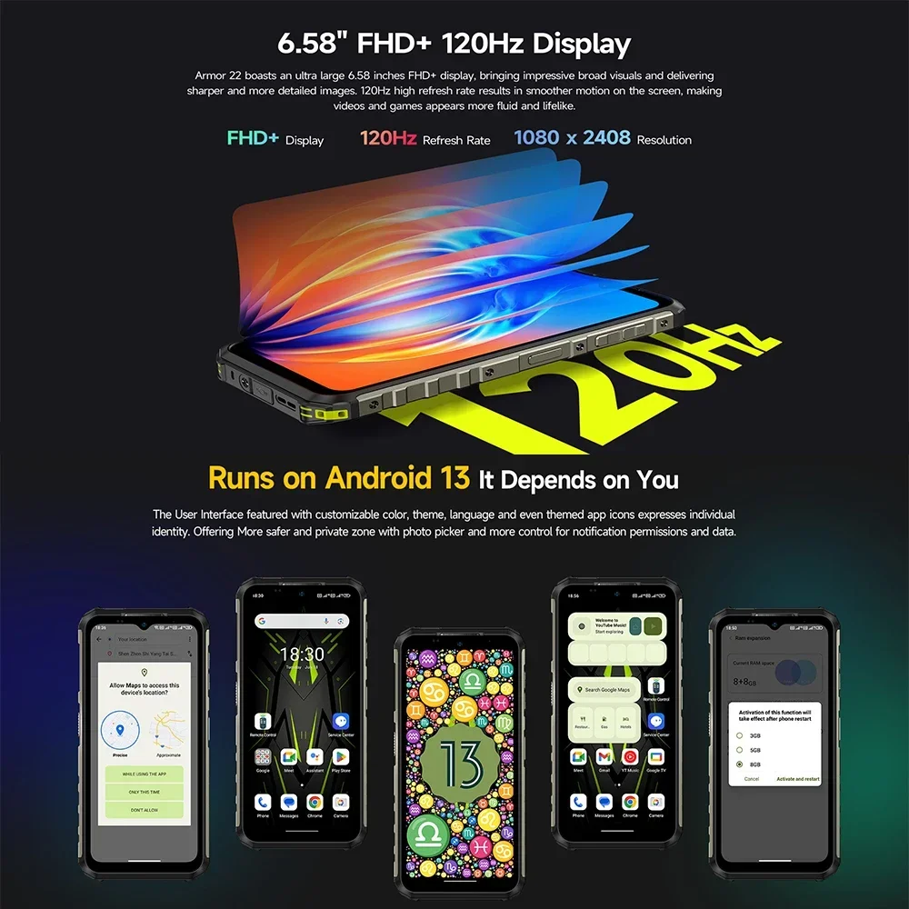 Armor 22 boasts an ultra large 6.58 inches FHD+ display, bringing impressive broad visuals and delivering sharper and more detailed images. 120Hz high refresh rate results in smoother motion on the screen, making videos and games appears more fluid and lifelike.