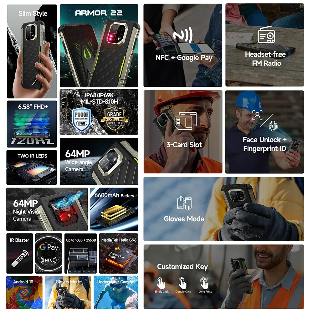 Ulefone Armor 22 Rugged Smartphone Android 13 6.58 Inch 8GB+256GB Mobile Phones 64MP Night Camera 6600mAh Cell Phone