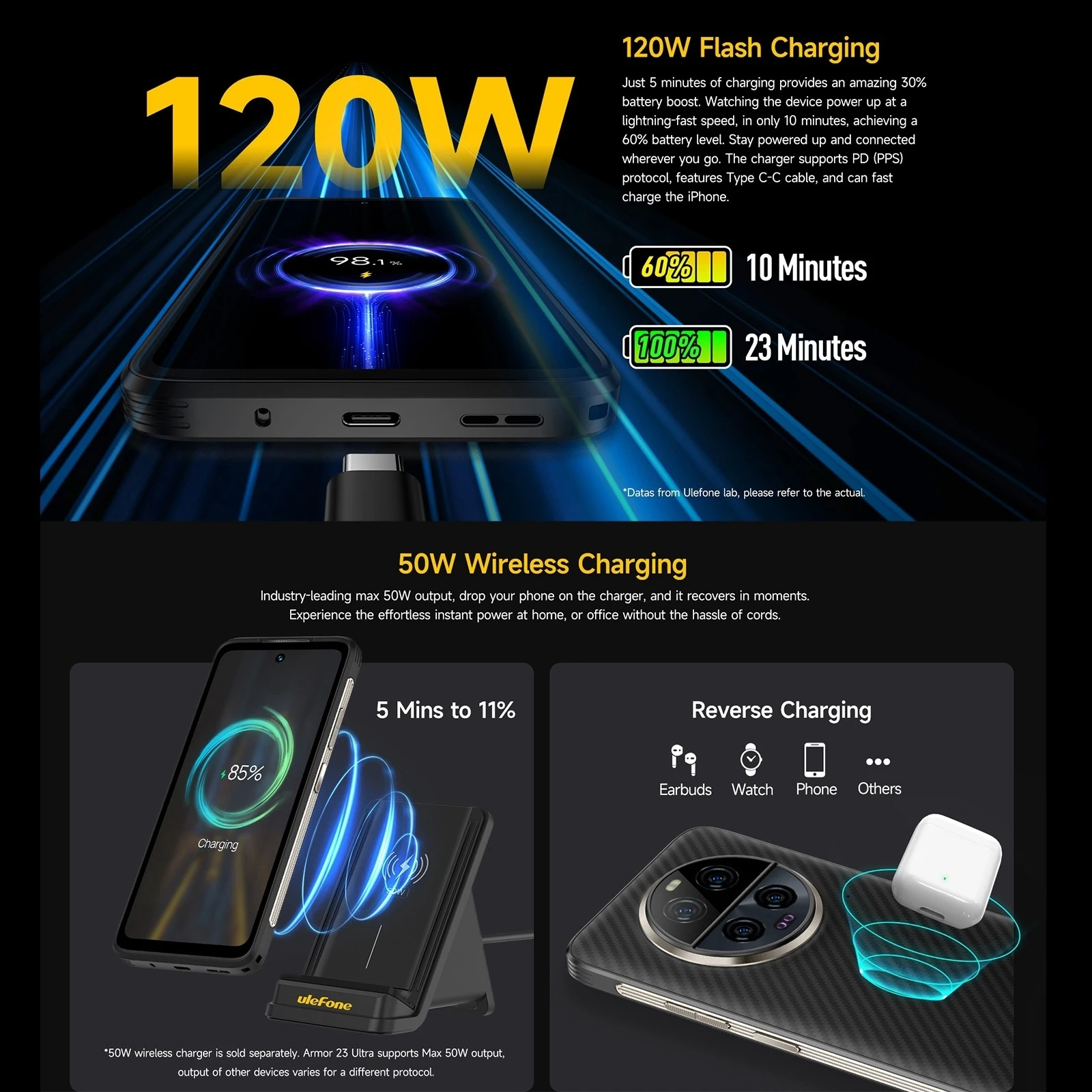 11. Charge: 120W, 20V/6A fast charging, support 50W wireless charging