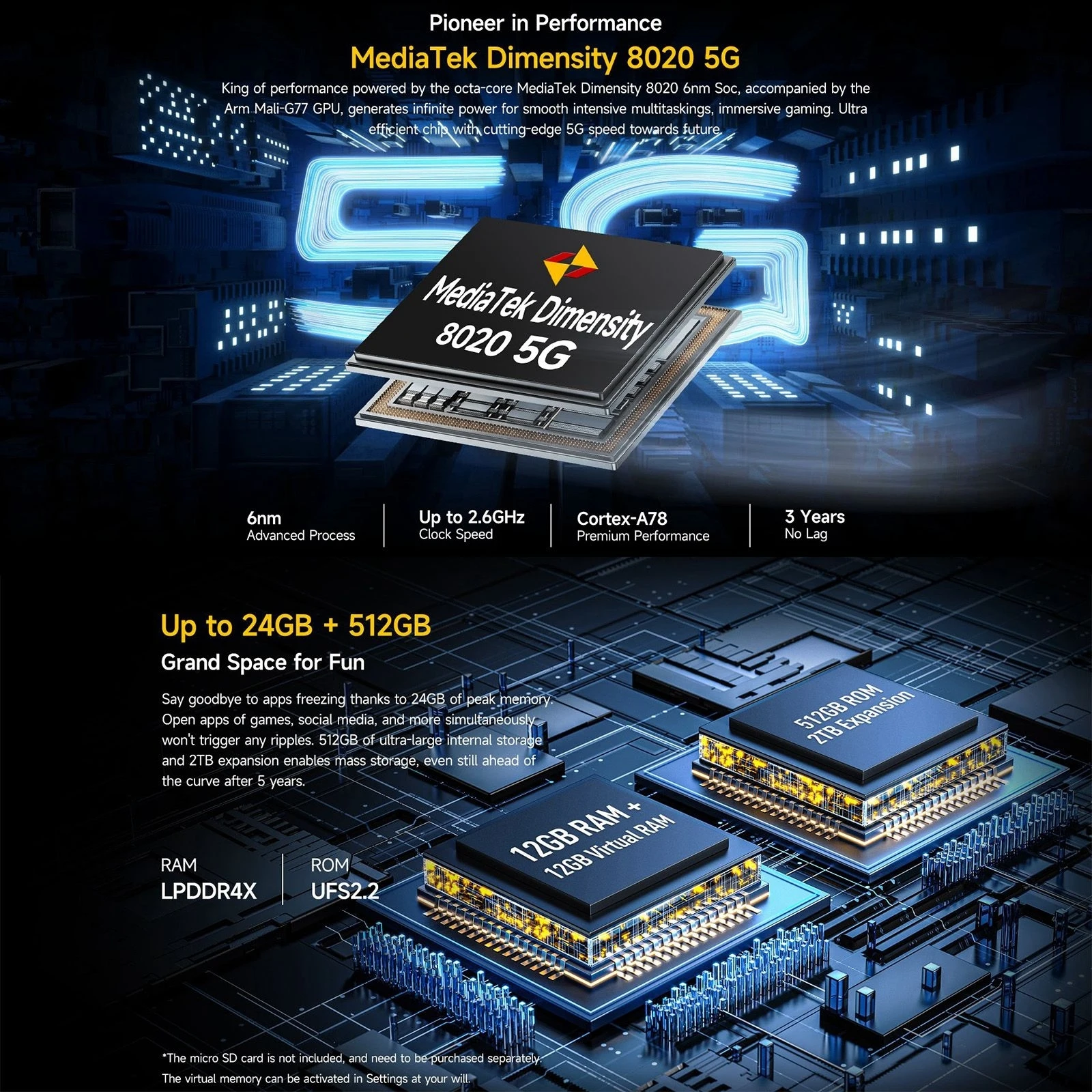 1. CPU: MediaTek Dimensity 8020, octa-core up to 2.6GHz, 4 x arm cortex-A78 + 4 arm x cortex-A55