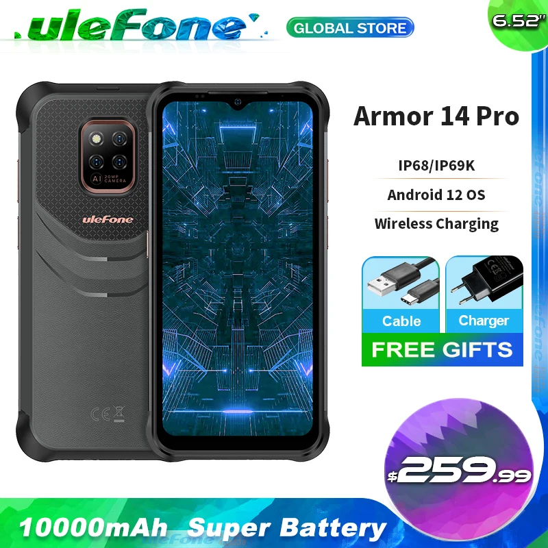 Ulefone Power Armor 14 Pro 6GB 128GB IP68/IP69K Rugged Cellphone 10000mAh Android 12 2.4G/5G Smartphone Wireless Charge NFC