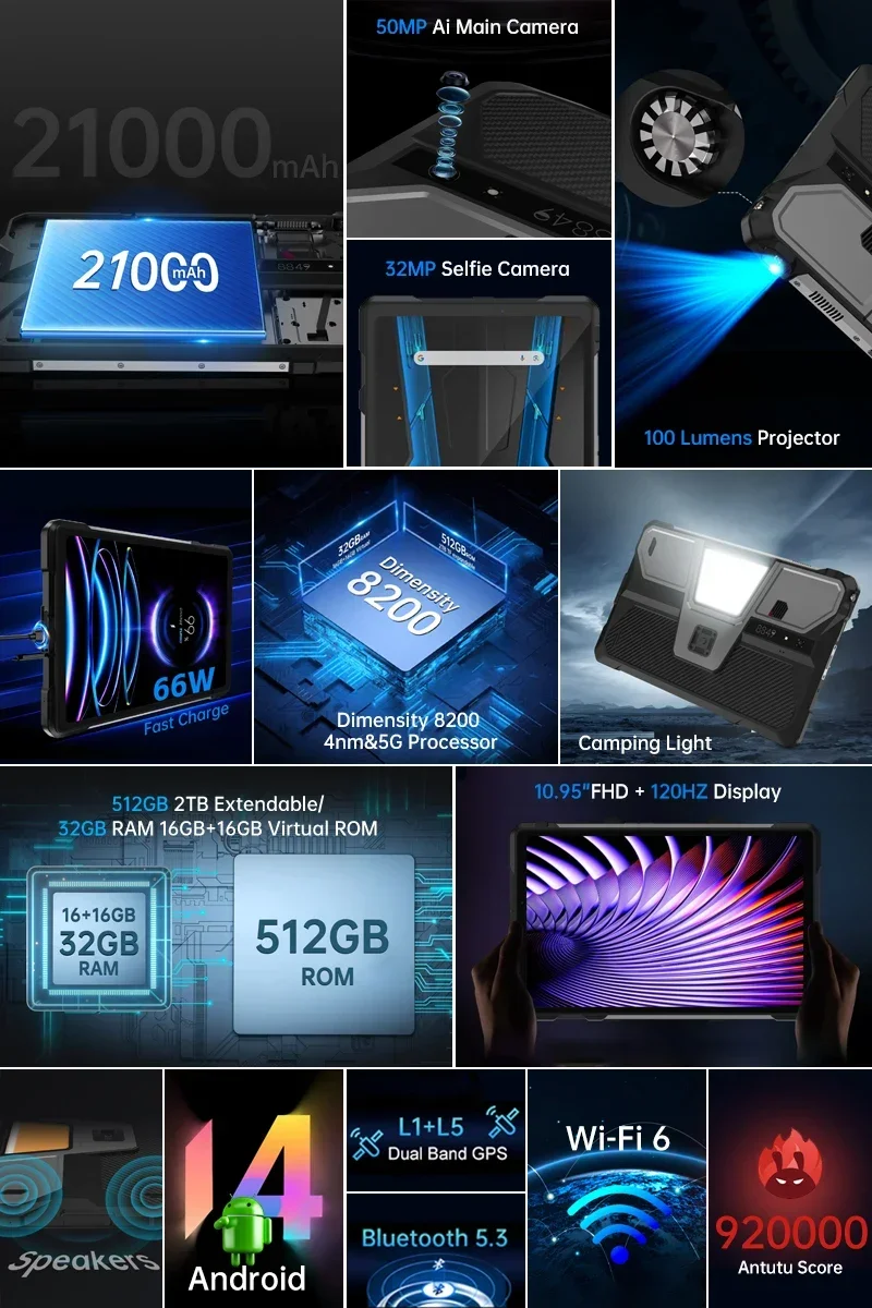 8849 TANK PAD Unihertz Rugged Projector Tablet PC 10.95 Inch 120Hz 16GB 512GB 21000mAh 50MP 66W Tablets Smartphone Android 14