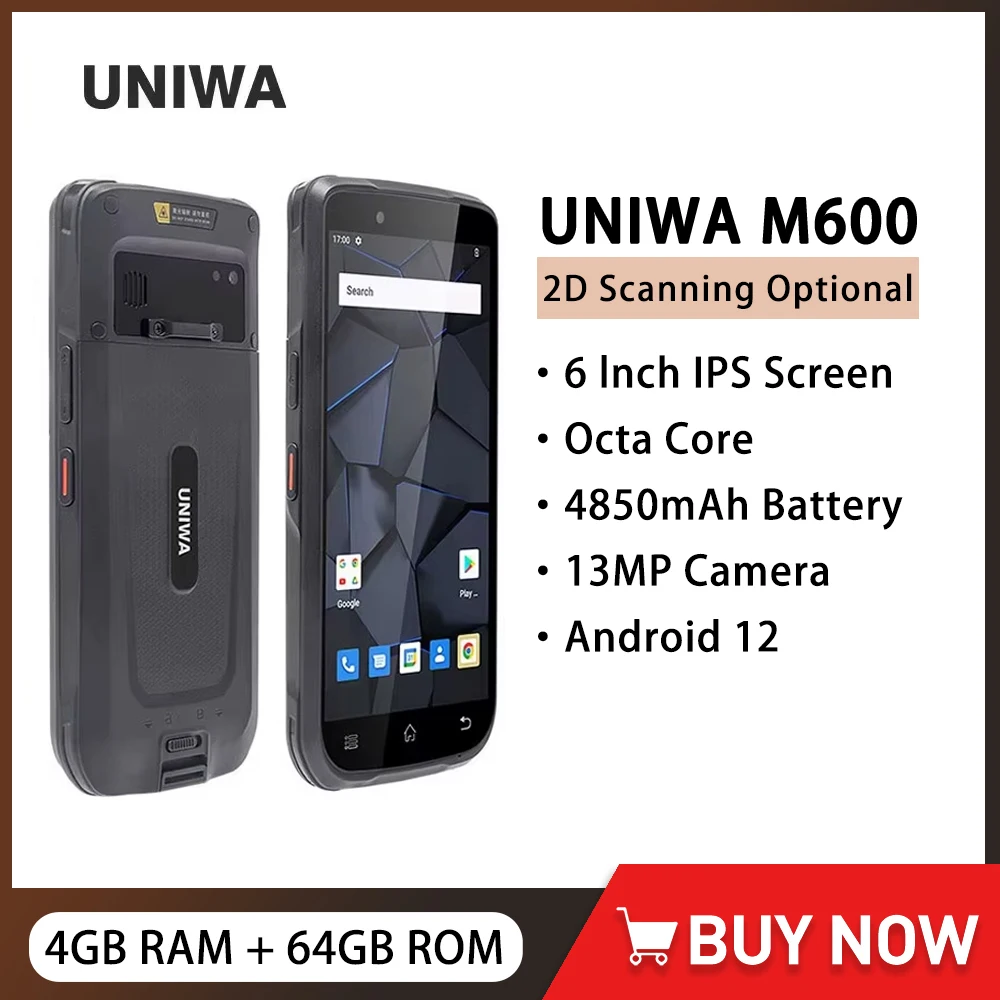 UNIWA M600 Rugged 4G Smartphone Android 12 Octa Core 6 Inch IPS 4GB+64GB Mobile Phone Handheld PAD 2D Scanning 4850mAh 13MP NFC