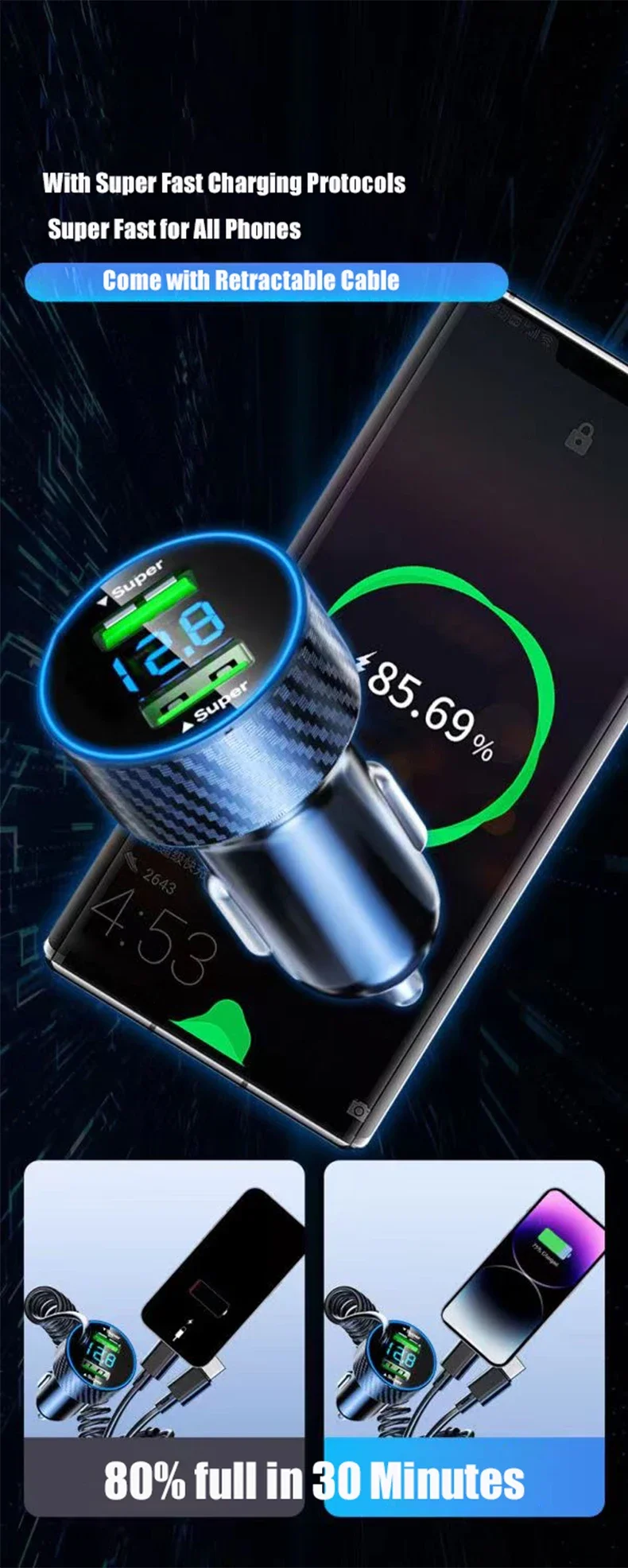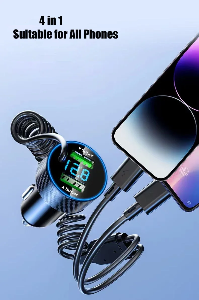 USB Car Phone Charger Adapter with Retractable Cable LED Voltage Monitor 4 in 1 Super Fast Charge for iPhone Samsung Huawei –