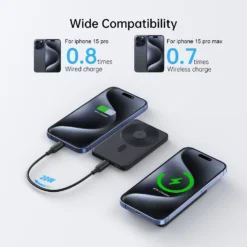 3. 5000mAh Capacity: With a capacity of 5000mAh, this portable wireless power bank can provide 1-2 full wireless charges compatible with iPhone 12-15 series. It’s ideal for short trips and commutes, ensuring your device stays powered throughout the day. This powerbank is a reliable power source.