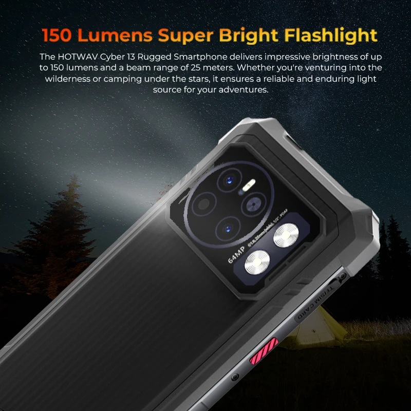 The HOTWAV Cyber 13 Rugged Smartphone delivers impressive brightness of up to 150 lumens and a beam range of 25 meters. Whether you’re venturing into the wilderness or camping under the stars, it ensures a reliable and enduring light source for your adventures.