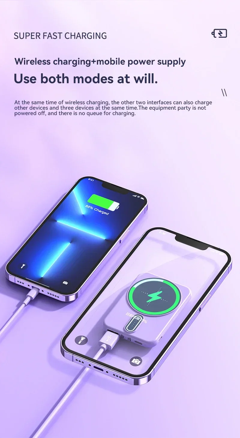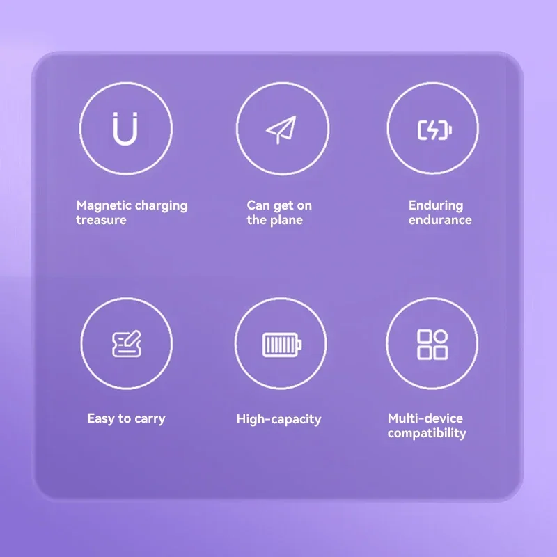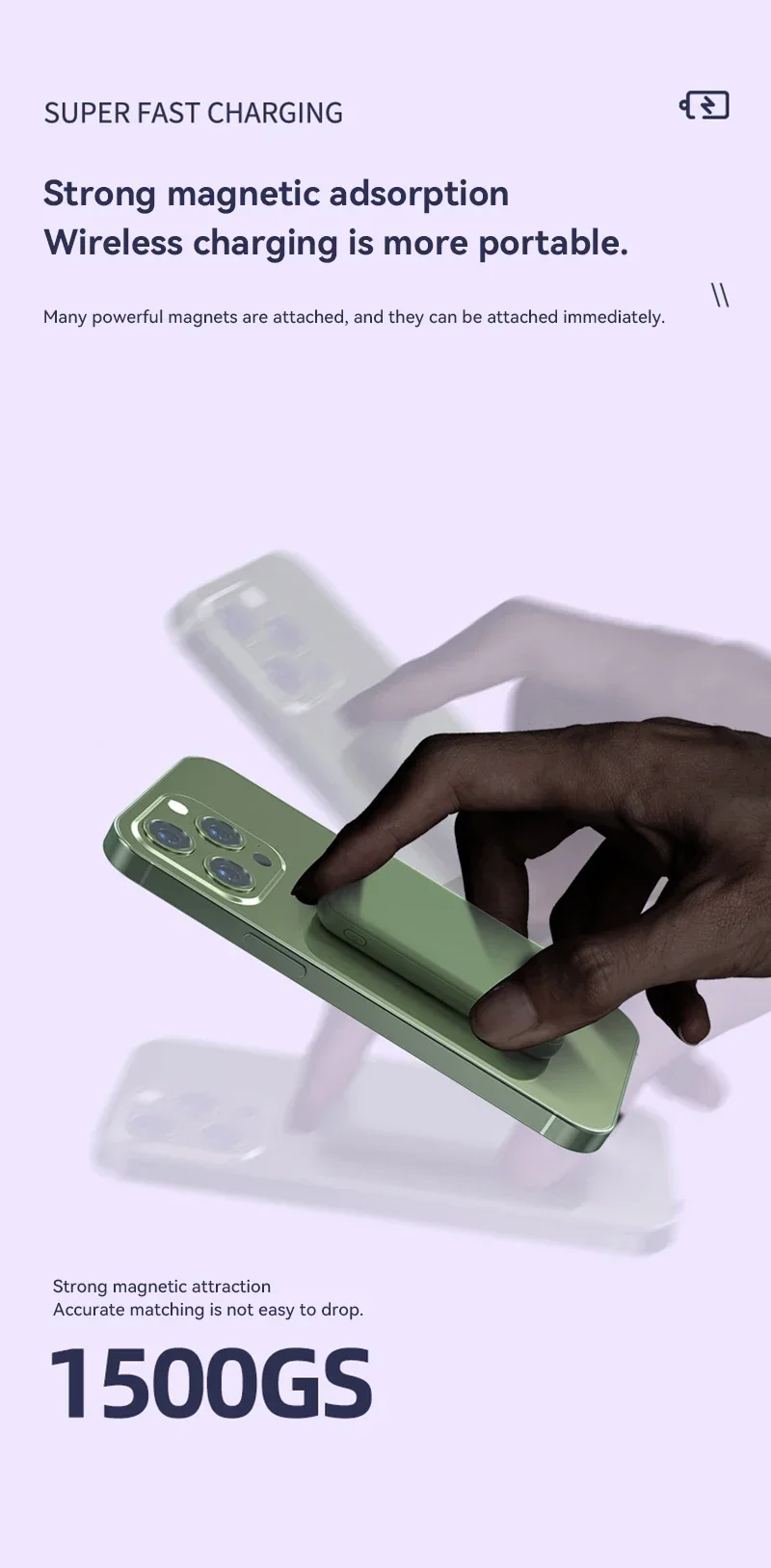 Specifications: Material: ABS+PC Capacity: 50000mAh Input voltage/current: 5V/2.1A Output voltage/current: 5V/2.1A Size: about 93*62*14mm Color: black, white, purple, green Features: Magnetic Powerbank Ultra-Portable Power Solution The Xiaomi 50000mAh Magnetic Power Bank is a portable powerhouse designed to keep your devices charged on the go. Its ultra-thin profile, at just about 93*62*14mm, makes it easy to slip into your pocket or bag without adding bulk. The sleek design comes in a choice of black, white, purple, or green, ensuring you find a color that suits your style. Advanced Wireless Charging Technology With its wireless high capacity feature, this power bank offers a seamless charging experience. Press the power button for one second to activate the automatic wireless charging mode, and enjoy the convenience of charging without cables. This innovative design allows for multiple interface charging, meaning you can charge your wireless devices and other devices simultaneously, enhancing your charging efficiency. Efficient Power Delivery The Xiaomi 50000mAh Power Bank is not just about convenience; it's also about efficiency. The strong magnetic adsorption ensures that your devices are securely attached, while the ice magnetic constant temperature design maintains a precise temperature control, reducing core loss and improving efficiency. The power bank's high capacity of 50000mAh means you can charge your devices multiple times, making it an ideal companion for long trips or outdoor activities. Package Contents and Accessories This power bank comes with a comprehensive package, including a power bank, a cable, a user manual, and a box. The cable is designed to provide fast charging, ensuring that your devices are powered up quickly. The user manual provides clear instructions on how to use the power bank effectively, while the box adds an extra layer of protection for your device. Whether you're at home, in the office, or on the move, the Xiaomi 50000mAh Magnetic Power Bank is the ultimate solution for keeping your devices charged and ready for action.
