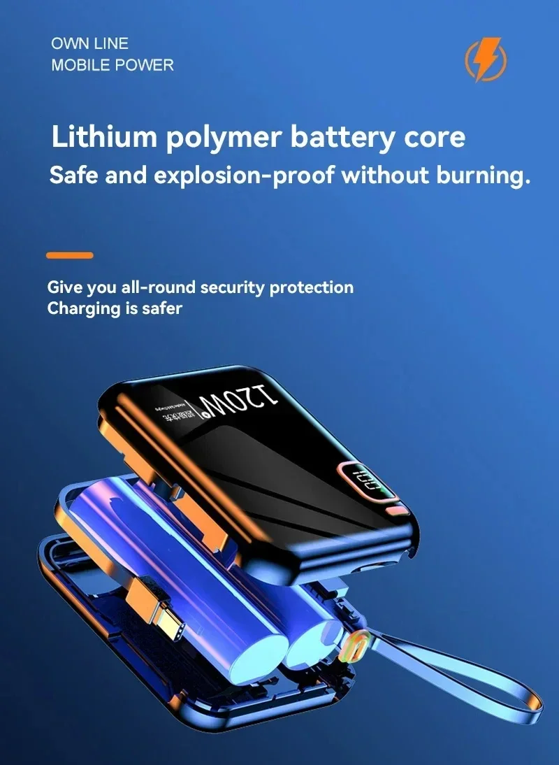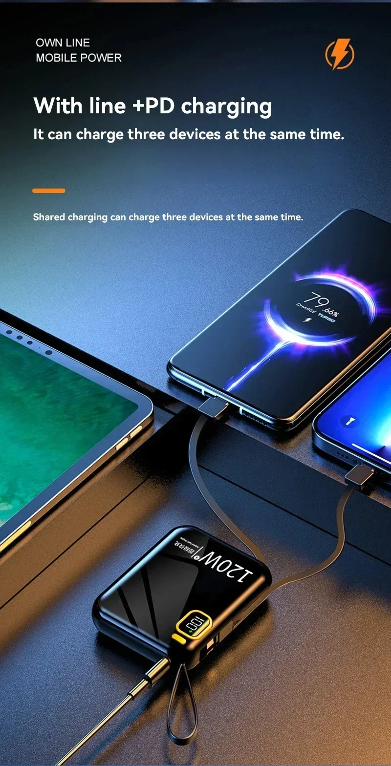 Specifications: Material: High-quality ABS plastic Battery Capacity: 50000mAh Charging Technology: PD 120W & Two-way Fast Charge Compatibility: iPhone, Xiaomi, Samsung, and more Design: Sleek and portable mini powerbank Size: Compact and lightweight for easy carrying Features: **Efficient Power on the Go** The Xiaomi 50000mAh Portable PD 120W Power Bank is a powerhouse of portable energy, designed to keep your devices charged and ready for action. With a robust 50000mAh battery capacity, this power bank can charge your smartphone multiple times, ensuring you stay connected even when you're away from a power outlet. The PD 120W technology allows for quick and efficient charging, while the two-way fast charger capability ensures that you can charge both your devices and the power bank simultaneously. **Versatile and Compact Design** The sleek and stylish design of this mini powerbank makes it an ideal companion for any traveler or professional on the move. Its compact size and lightweight build make it easy to carry in your pocket or bag, ensuring that you always have a reliable power source at hand. Whether you're commuting, traveling, or simply out for the day, this power bank is your go-to solution for staying powered up. **Universal Compatibility** This power bank is not just about capacity; it's about versatility. Compatible with a wide range of devices, including iPhones, Xiaomi, and Samsung smartphones, it ensures that you can charge any device with ease. The power bank's intelligent charging technology detects your device's power needs and delivers the optimal charge, ensuring that your devices are always ready for use. With the Xiaomi 50000mAh Portable PD 120W Power Bank, you'll never have to worry about running out of power again.